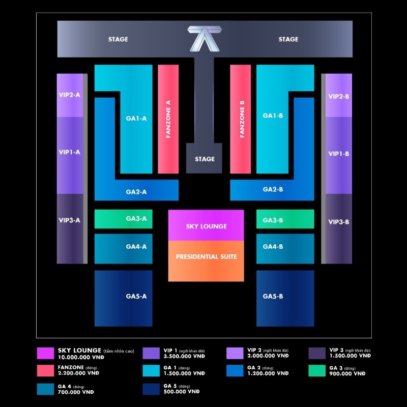 • Tìm hiểu sơ đồ sân khấu (Seating Chart): Mỗi khu vực (Zone) sẽ có ưu và nhược điểm riêng. Khu Standing (đứng) giúp bạn ở gần thần tượng nhất nhưng đòi hỏi thể lực bền bỉ. Khu Seating (ngồi) phù hợp để thưởng thức trọn vẹn phần dàn dựng sân khấu.